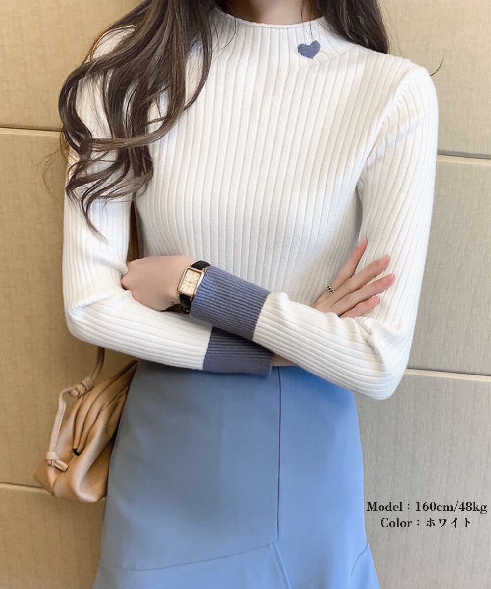 レディース ニットソー リブニット ハート刺しゅう 大人カジュアル 着やせ 韓国風 着回し